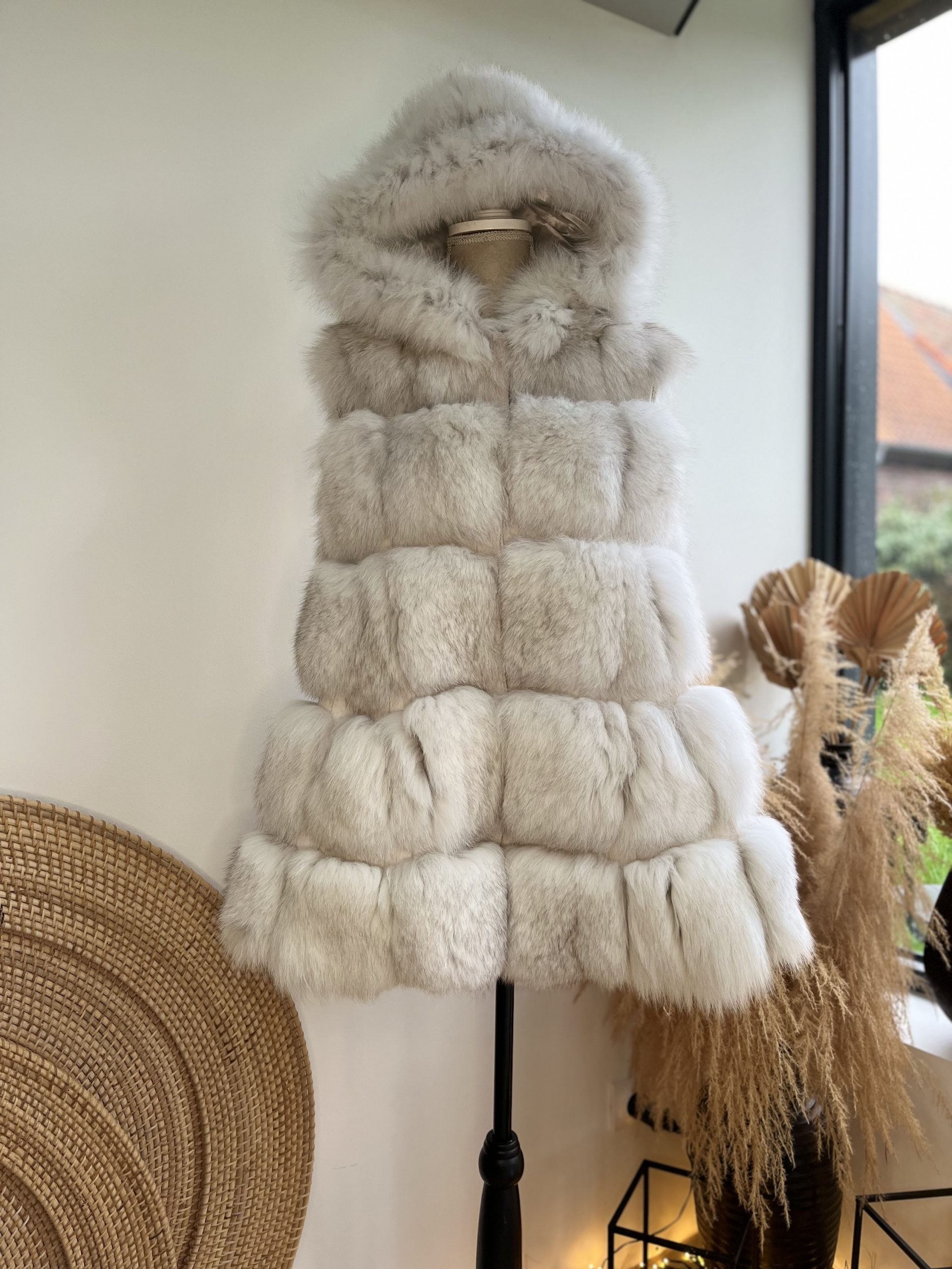 Veste en fourrure de Renard forme évasée avec une capuche.
